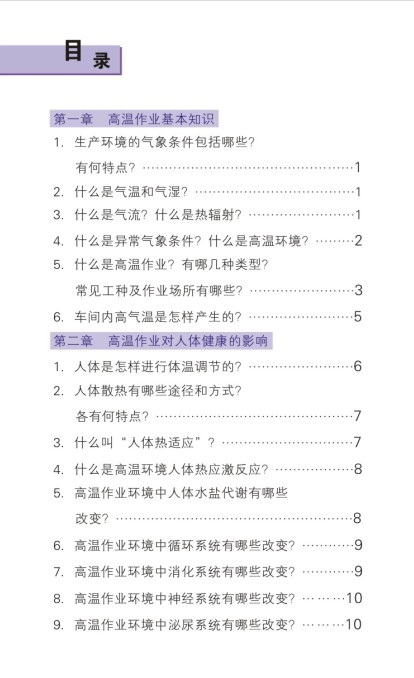 本书主要内容包括高温作业基本知识、高温作业对人体健康的影响、职业性中暑的处置、高温作业预防保健措施等;以问答形式介绍了高温的作业岗位、高温作业的危害,以及如何采用现场急救措施、如何预防职业性中暑的发生与发展,保护高温作业人员的健康;是一部面向劳动者和企业的科普宣传手册,也可作为改善工作环境、防治职业性中暑的参考资料,也可作为高温(热浪)突发事件指导公众采取防护措施的技术手册。